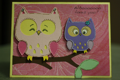 This is a card I made for my daughters to give to their Grandparents for Valentine's Day. The two little owls represent my two girls, Bria and Brittyn. I used owls from Create A Critter (my favorite cart!), face stamps from Peachy Keen, and the sentiment is from My Pink Stamper. I added some doodling with my white Gelly Roll pen and some bling from the dollar store (I think... I got it a long time ago...). Isn't it cute? :)